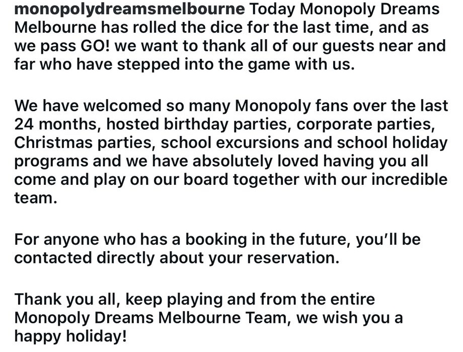 Melbourne’s first Monopoly-themed indoor attraction has officially closed its doors, just two years after finally opening to the public — bringing an ambitious, high-profile project to a quiet and somewhat controversial end.
